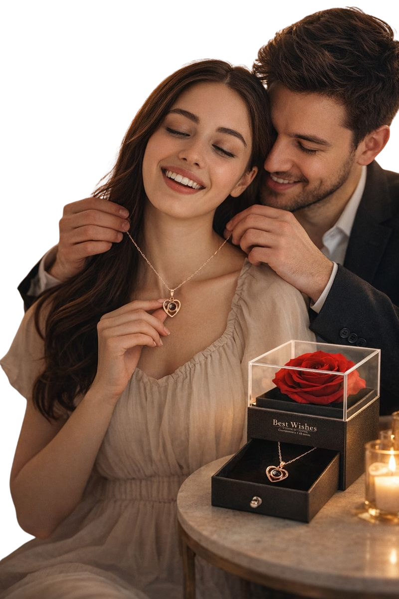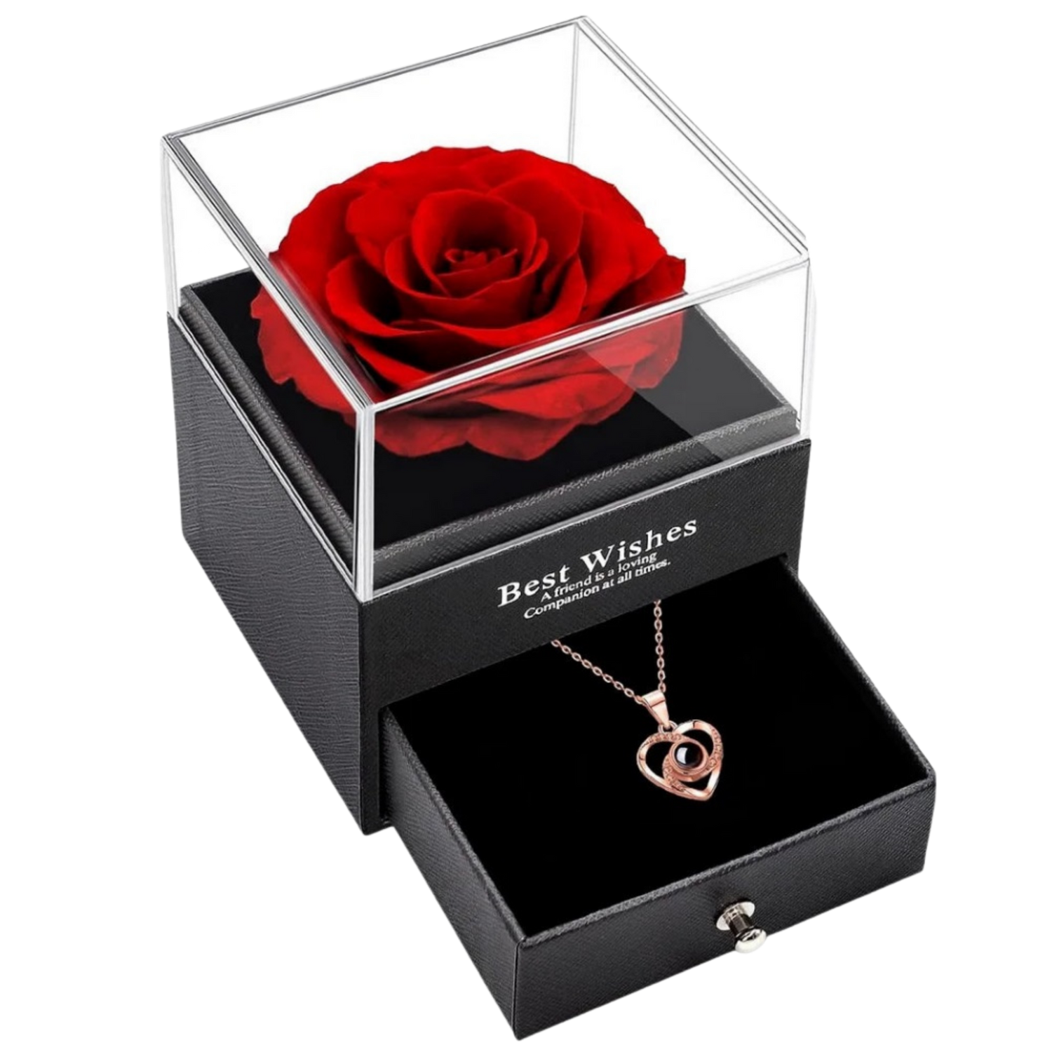 Demuestra tu amor a tus seres queridos con esta rosa preservada que dura años intacta y un collar que dice Te amo en 100 idiomas.